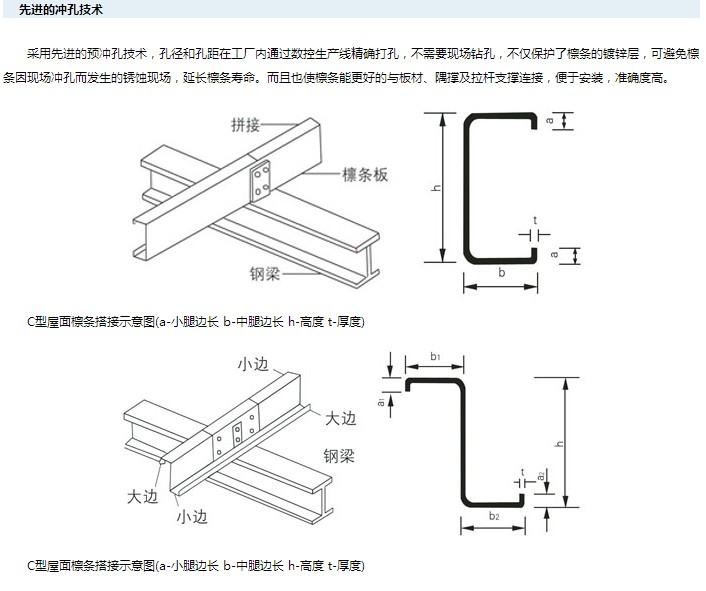 C型鋼是經熱卷板冷彎加工而成的,壁薄自重輕,截面性能優良,強度高,與傳統槽鋼相比,同等強度可節約材料30%。廣泛用于鋼結構建筑的檁條、墻梁,也可自行組合成輕量型屋架、托架等建筑構件。此外,還可用于機械輕工制造中的柱、梁和臂等。